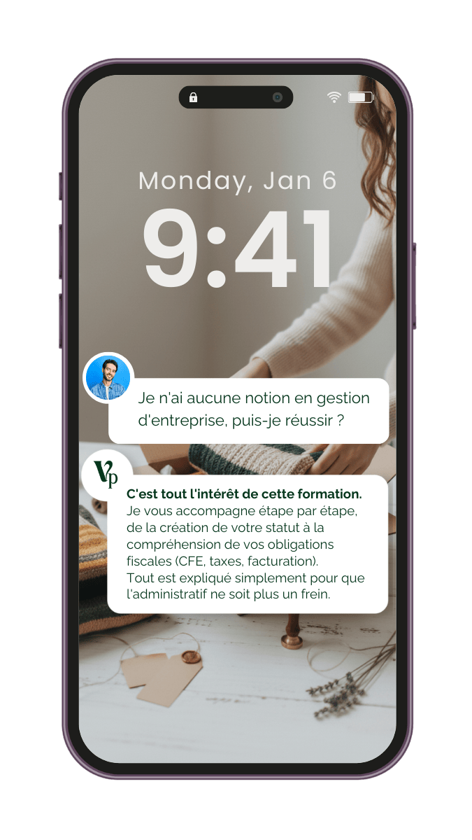 C'est tout l'intérêt de cette formation. Je vous accompagne étape par étape, de la création de votre statut à la compréhension de vos obligations fiscales (CFE, taxes, facturation). Tout est expliqué simplement pour que l'administratif ne soit plus un frein.